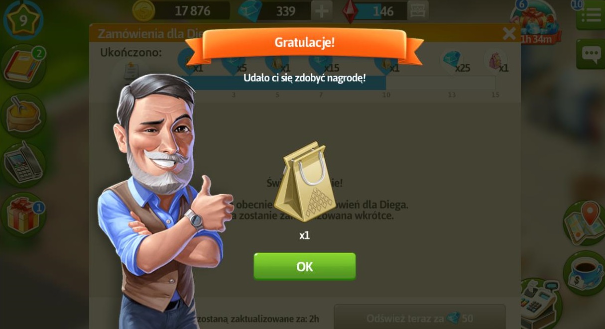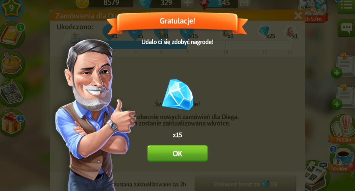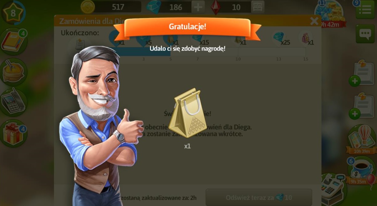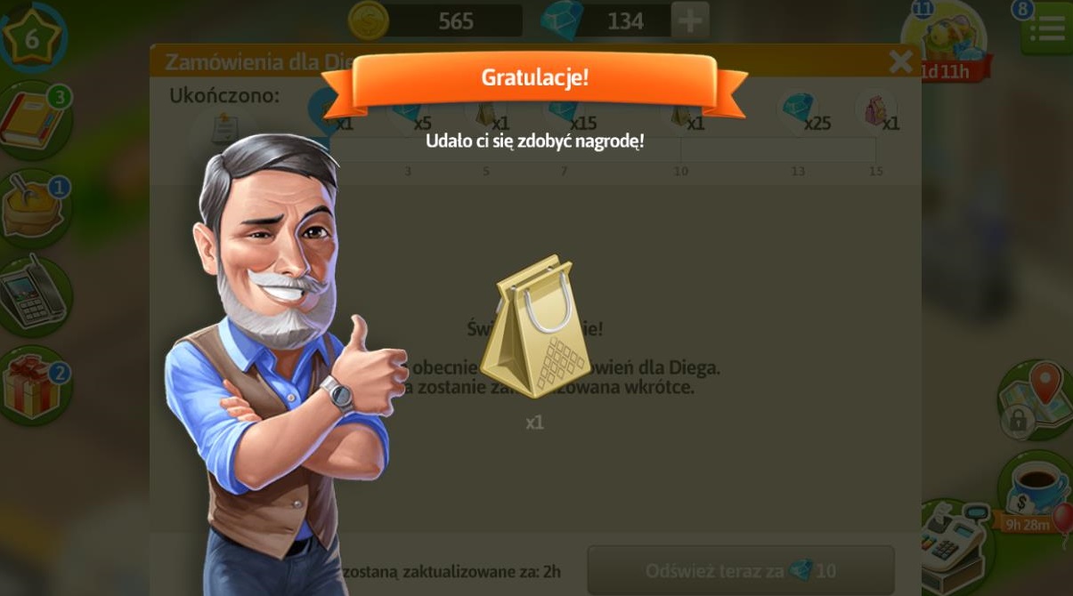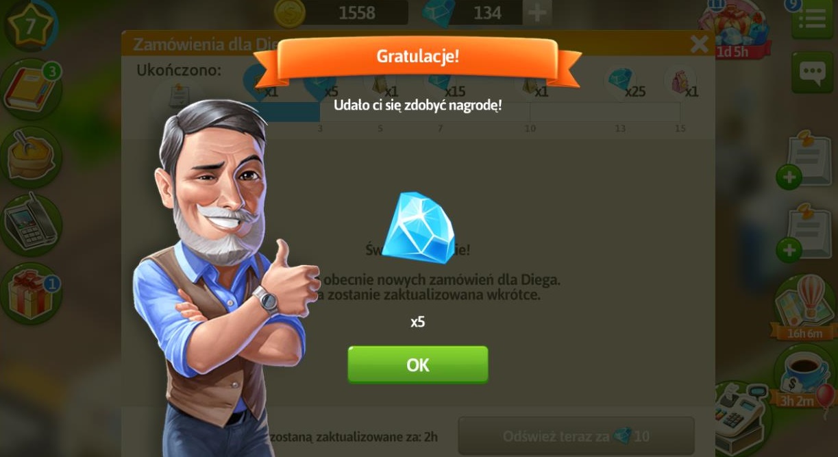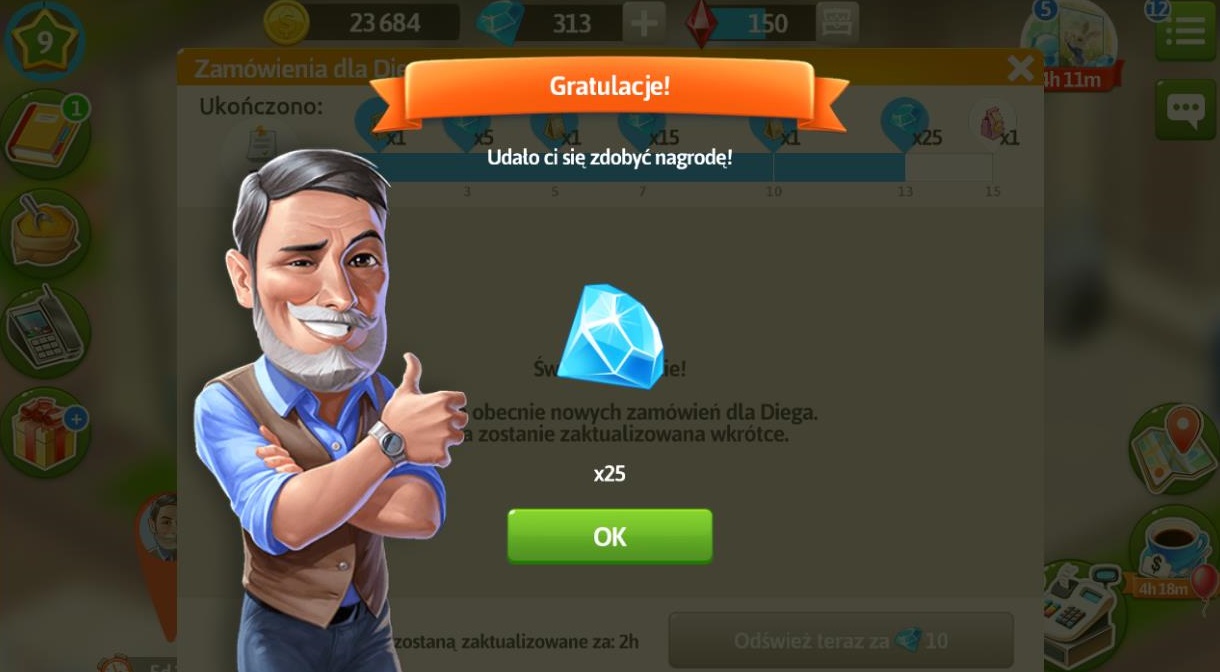 Po wykonaniu 15 zamówień i otrzymaniu różowego prezentu, nadal możemy przyjmować zamówienia jednak nie dostaniemy za ich realizację prezentów i diamentów, jedynie przyprawy i monety.