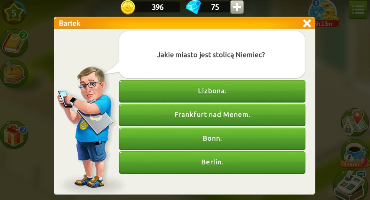 Przypominam Bartek pojawia się u nas od poziomu 3, jednak Quiz przeprowadza dopiero od poziomu 4, możemy odpowiadać na pytania i zdobywać dodatkowe monety za każdą udzieloną odpowiedź. Bartek zadaję nam dziennie po 3 pytania, odpowiedzi znajdziesz w moich artykułach, jeżeli udzielimy błędnej odpowiedzi nie podnosimy w związku z tym żadnej kary. Możemy również zamknąć okno dialogowe z pytaniem (nie odpowiadając na nie) i otworzyć ponownie, aby uzyskać nowe pytanie.