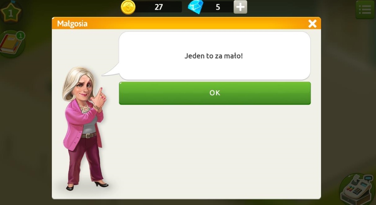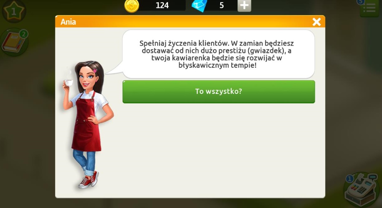 Uwaga: Zanim ukończysz poziom 1 upewnij się, że masz 140 monet na zakup ekspresu do espresso, który pojawia się na poziomie 2.