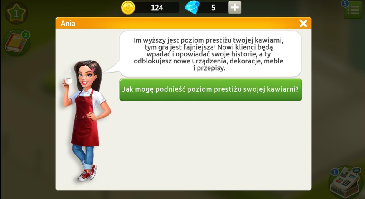 Ania informuje nas o tym, że im wyższy jest poziom prestiżu naszej kawiarni tym gra jest fajniejsza, ponieważ nowi klienci będą opowiadać nam swoje historię. Możemy odblokować nowe urządzenia, dekorację, meble oraz przepisy.