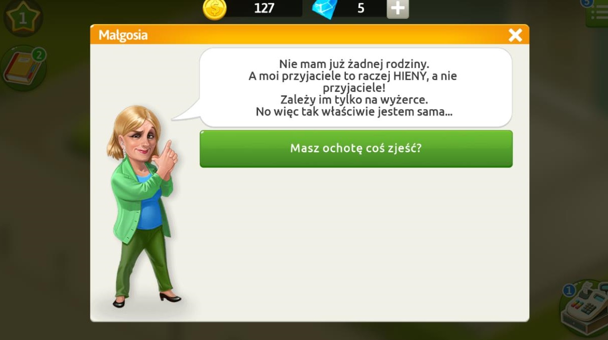 Małgosia opowiada, że nie ma żadnej rodziny, wspomina o uroczych małych babeczkach, dlatego jak najszybciej musimy zakupić gablotę z babeczkami.