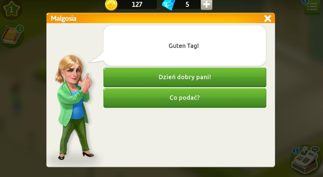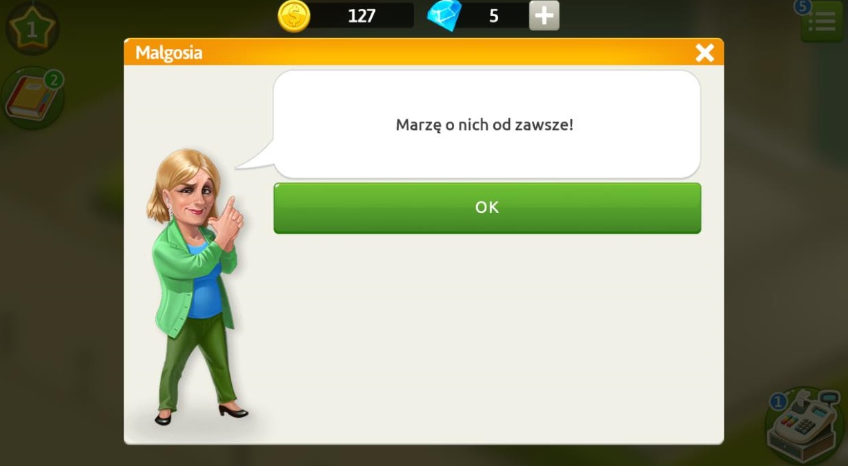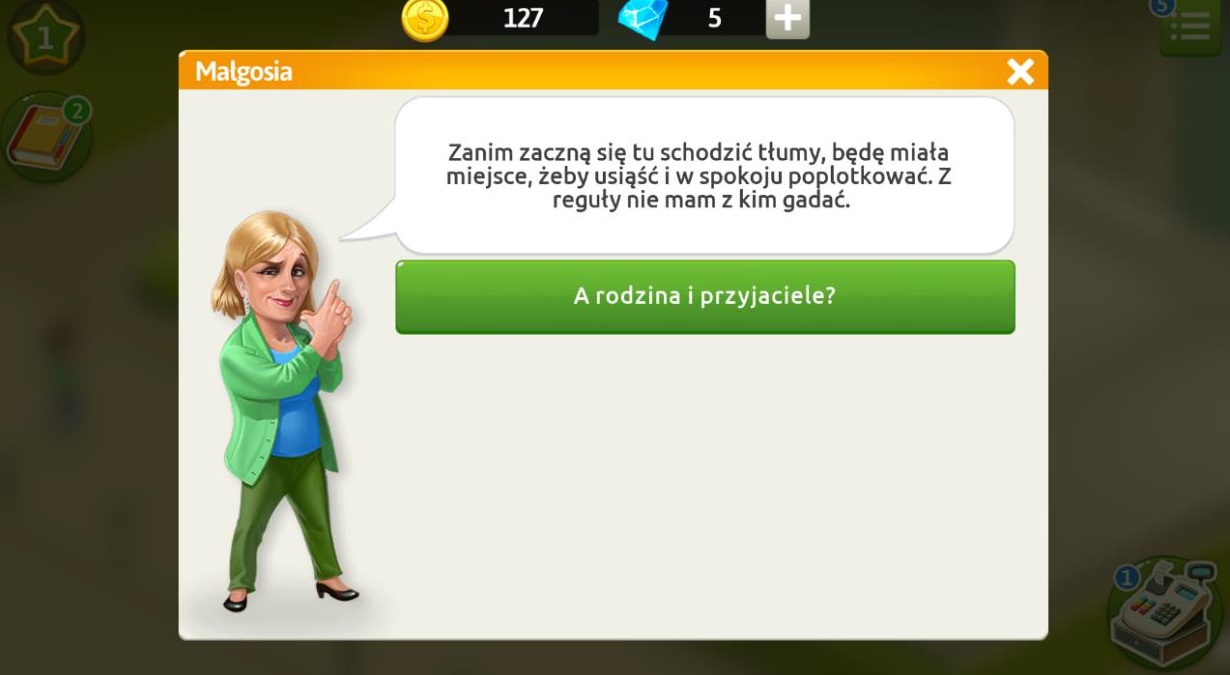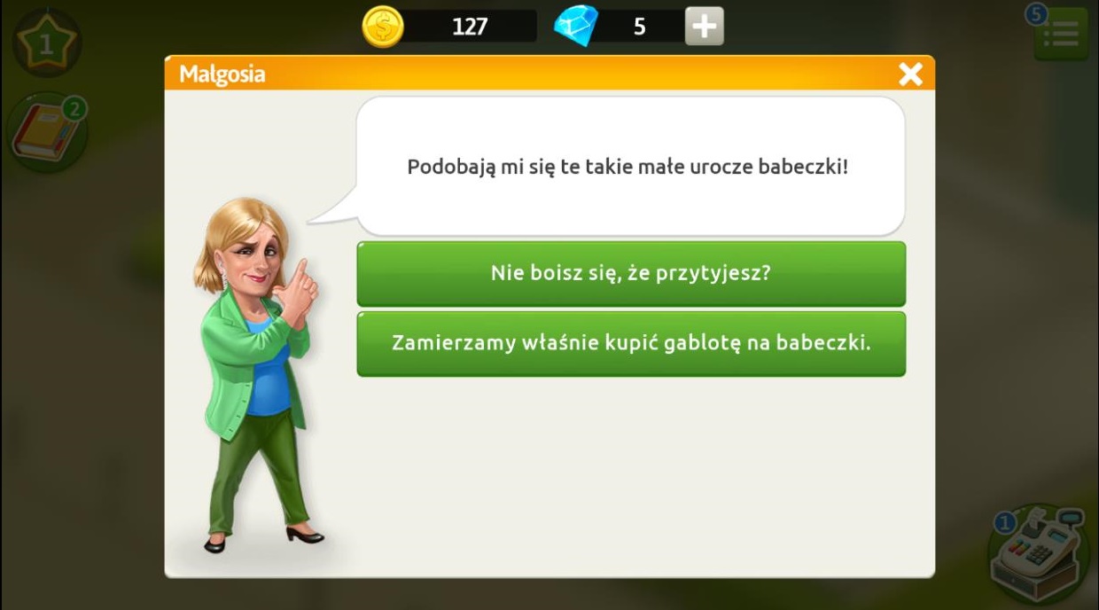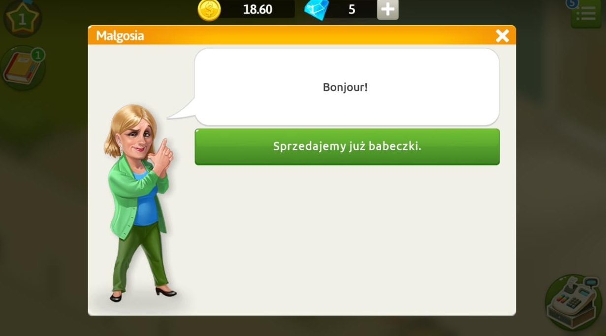 Na poziomie pierwszym zdobyliśmy nowego klienta – Małgosie. Rozbudowaliśmy kawiarnie o dodatkowe stoliki, krzesła i szafki na których możemy postawić sprzęty. Zakupiliśmy gablotkę na babeczki jak również odblokowaliśmy nowy przepis Babeczka.