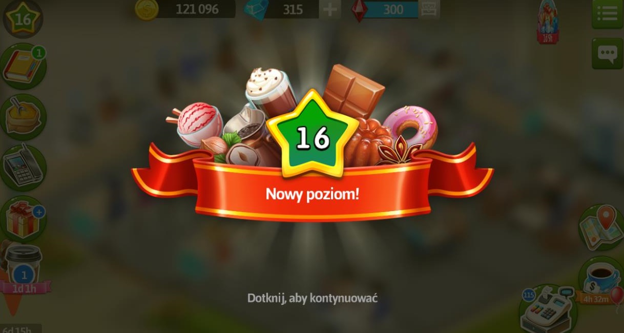 Uwaga: Zanim ukończysz poziom 16 upewnij się, że masz 130 000 monet na zakup gabloty na ciasto czekoladowe, która pojawia się na poziomie 17.