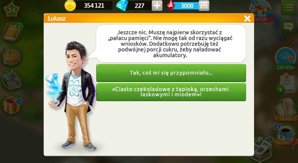 Kiedy Łukasz zjawia się w naszej kawiarni, informuję, że dostał już dokumenty od Oliwii, a nawet zaczął je już przeglądać. Niestety jeszcze nic nie może powiedzieć na temat sprawy, najpierw potrzebuje podwójnej porcji cukru, żeby naładować akumulatory i skorzystać z „pałacu pamięci”.