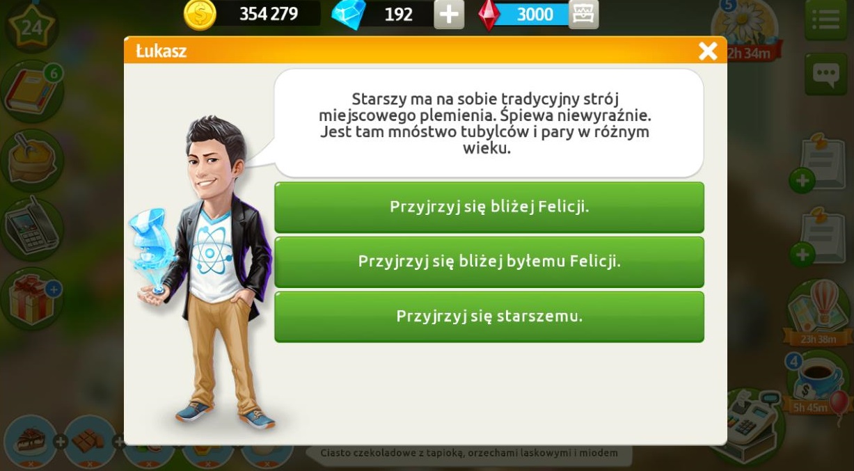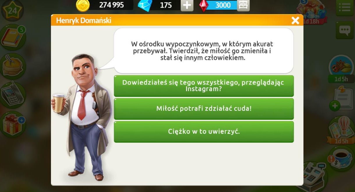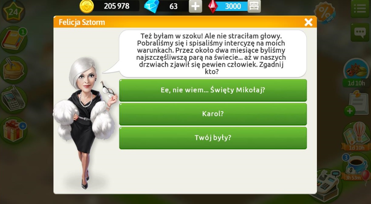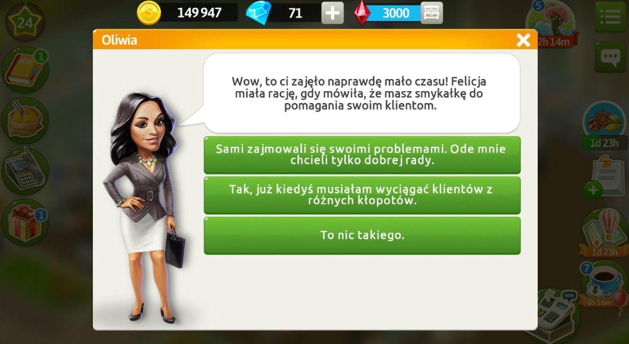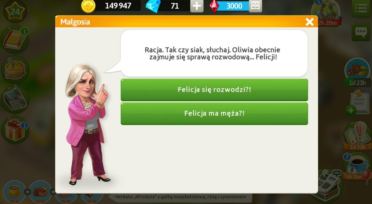 Marysia jest przestraszona, ponieważ myśli, że Felicja chce ją zwolnić, a chciała tylko jak najlepiej. Prosi o przygotowanie kawy „Bahrajn” z różą, kardamonem i szafranem, żeby mogła się uspokoić i nam wszystko wyjaśnić. Po przygotowaniu napoju dowiemy się, że klientka doradziła swojej szefowej wyjazd, ponieważ mógł być świetny materiał do magazynu. Tydzień mody letniej po raz pierwszy został zorganizowany na tropikalnej wyspie, a nie w dużym mieście. Marysia zobaczyła ulotkę, gdy segregowała pocztę Felicji, potem dostała kolejną, a później jeszcze spersonalizowane mailowe zaproszenie. Okazuje się, że na ten adres e-maile przychodzą tylko najważniejsze maile służbowe i mało kto go zna. Jeśli chodzi o duży przelew, to klientka dostała pieniądze od swoich rodziców na ślub. Za pomoc otrzymujemy 5 diamentów.