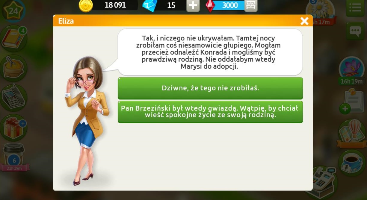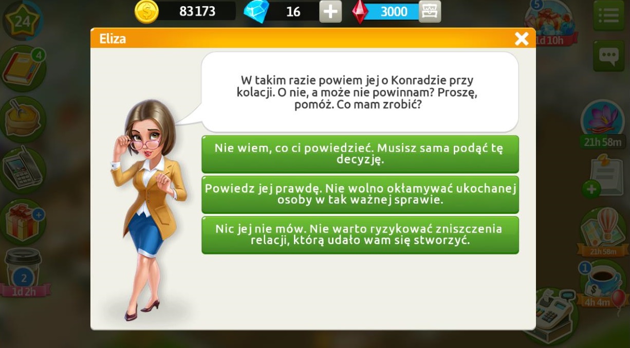 Eliza bardzo denerwuje się przed randką z Konradem, dlatego prosi nas o zakup lampy „Zorza Polarna” w cenie 80 000 dolarów. Po zakupie czuje się lepiej, w nagrodę otrzymujemy diament.