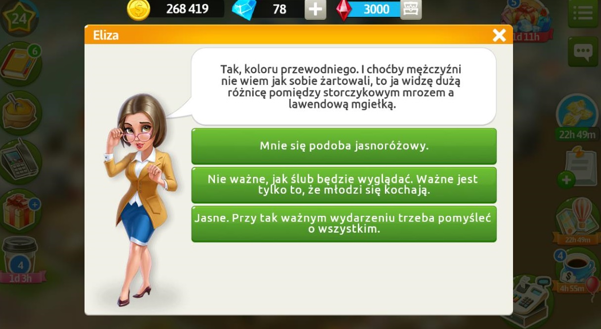 Marysia jest szczęśliwa, ponieważ w końcu wszystko wróciło do normy i teraz może skupić się na pracy oraz ślubie. Twierdzi, że z Konradem nigdy nie stworzyli by idealnej rodziny, ale to nie znaczy, że nie mogą być dobrymi przyjaciółmi. Do ołtarza naszą klientkę poprowadzi przybrany ojciec, ale Konrad będzie śpiewał i zostanie gościem honorowym. Za pomoc dostajemy 5 diamentów.