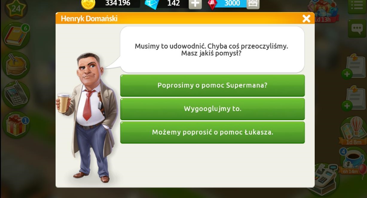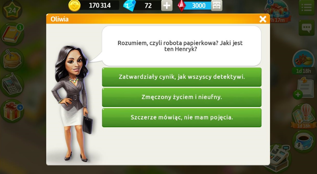 Henryk uświadomił sobie, że sprawa Oliwi jest zbyt skomplikowana i musiałby poświęcić jej dużo czasu, a i tak razem z Łukaszem jest zawalony robotą. Okazuje się, że Łukasz wynalazł nanoustrojstwo mniejsze od kropli wody, którego opatentowanie wymaga tony papierów. Klient prosi nas o przygotowanie herbaty mrożonej „Arktyczna Guarana” z miętą i cytryną na wzmocnienie. Po przygotowaniu napoju Henryk zgadza się pomóc. Na początek musimy dotrzeć do sedna problemu, zacznijmy od rozmowy z Oliwią i Felicją. Najpierw przeprowadźmy rozmowę z Oliwią i dowiedźmy się ogólnych informacji na temat sprawy. Za herbatę otrzymujemy 3 diamenty.