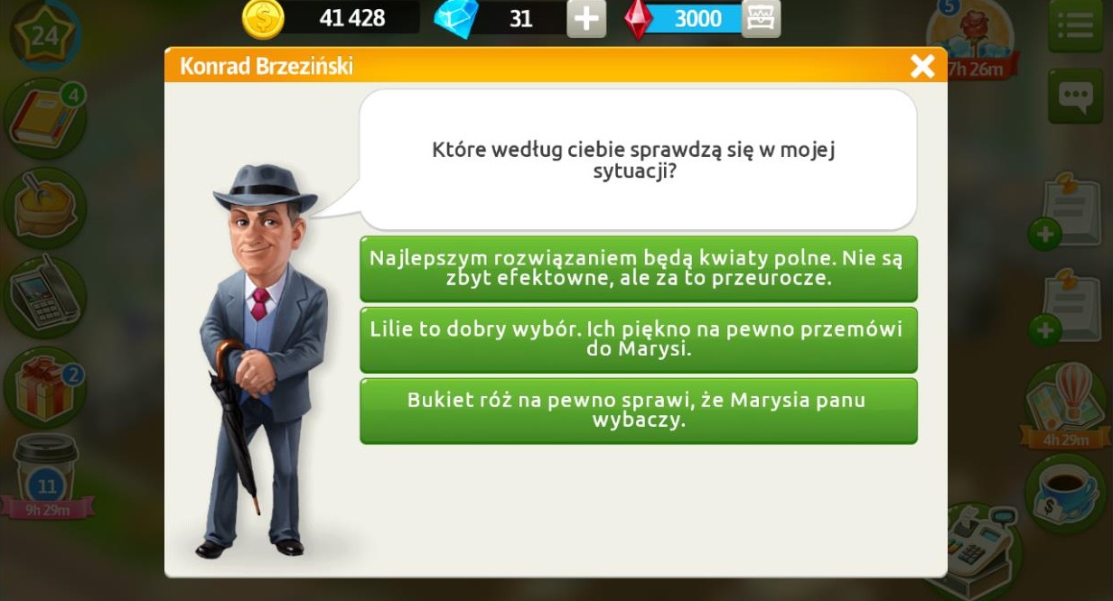 Marysia wpadła w szał i powiedziała naszemu klientowi, aby się nie wtrącał w jej życie. Felicja chciała zabrać Marysię do Mediolanu, ale przez niego nie zabrała. Zrozpaczony Konrad chce przeprosić swoją córkę i podarować bukiet kwiatów, prosi nas abyśmy popytali klientów jakie kwiaty daje się teraz kobietom.