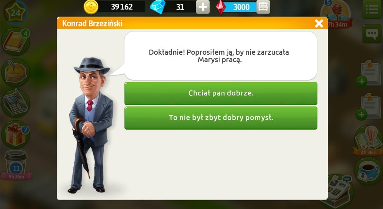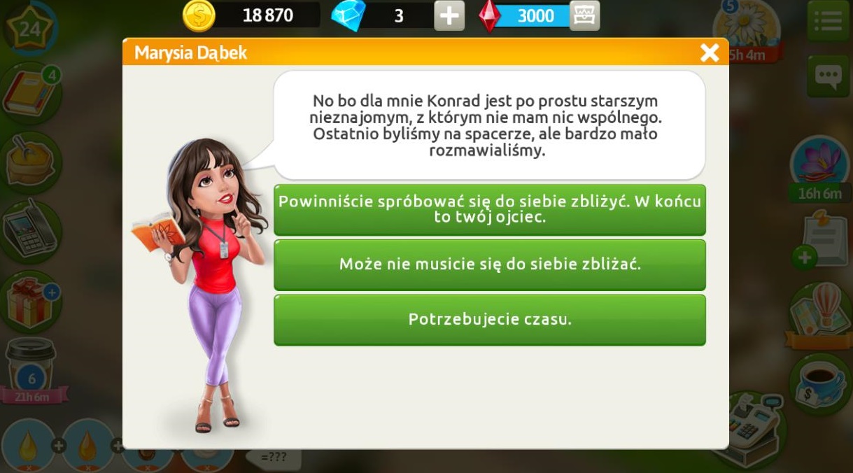 Przekażmy Konradowi, że jego córka ma bardzo dużo pracy i nie ma czasu na spotkania. Klient opowiada nam o spacerze, na którym nie mógł znaleźć porządnego tematu do rozmowy. Wyczuwa w swojej więzi z Marysią pewne napięcie, ale nadal chce utrzymywać z nią kontakt.