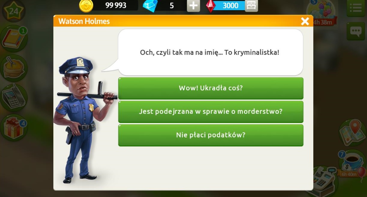 Przejdźmy do Watsona opowiadać, że mamy nową klientkę Oliwię, policjant natychmiast wyzywa ją od kryminalistek.