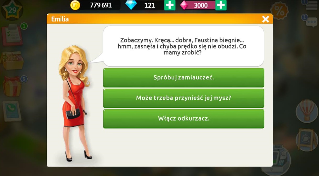 Po zakupie kanapy „Góra Lodowa” wracamy do Małgosi, która informuje nas, że ma leniwca i Emilia niedługo dostanie go do swoich reklam. Za zakup kanapy otrzymujemy 10 diamentów.